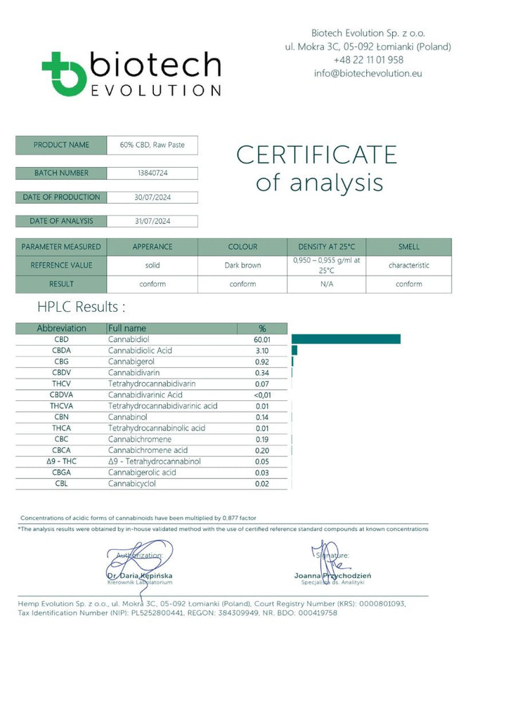 Datos clave del fabricante: “60% pasta de CBD/CBDA” – 6000 mg por jeringa de 10 g; extracto Full Spectrum; ≤ 0,2% THC.