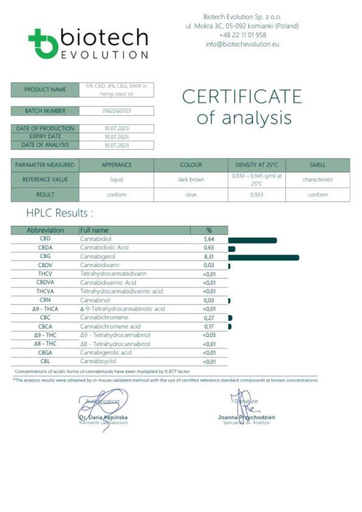 - Perfil: 8% CBG + 6% CBD · THC ≤0,2% (etiqueta del fabricante).