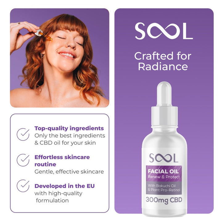 SOOL CBD Facial Serum Renew & Protect 300 mg (formato 30 ml) pensado para tu rutina facial con una textura ligera tipo serum que se absorbe rápido y deja un acabado confortable y luminoso. Fórmula de espectro amplio que combina CBD con aceite de bakuchi (bakuchiol) y plant pro-retinol de origen vegetal.