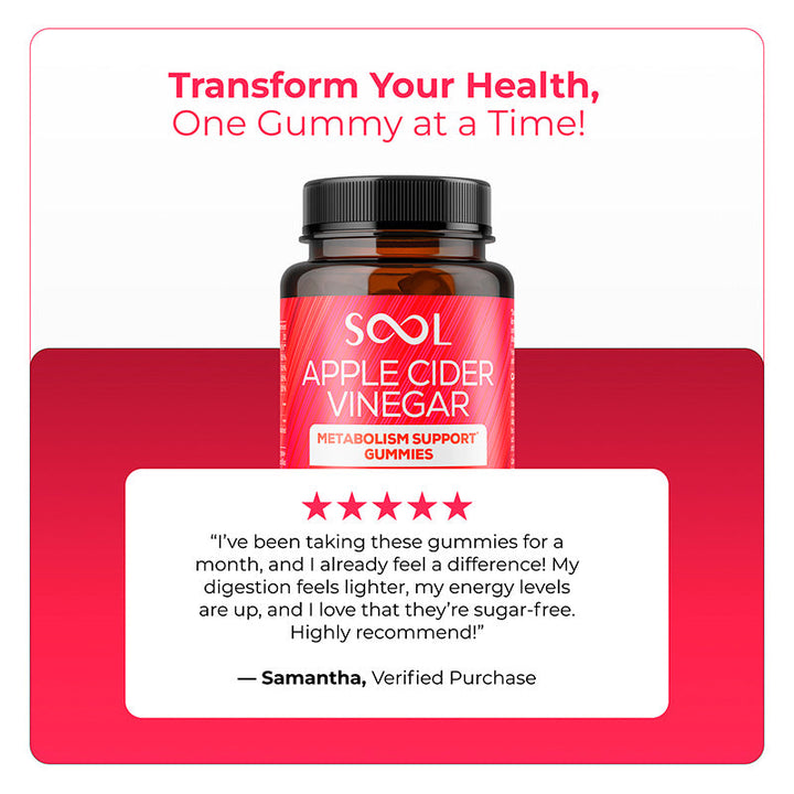 SOOL Apple Cider Vinegar Metabolism Gummies (envase de 60 gomitas) pensadas para integrar el vinagre de manzana (ACV) en tu rutina diaria de forma sencilla y agradable. Fórmula con vitaminas del grupo B, cromo y probióticos Lactospore®, con perfil afrutado y sin la acidez intensa del ACV líquido.