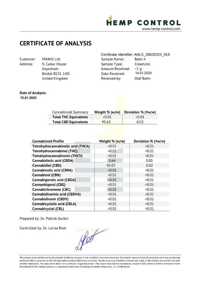 Ingredientes (según fabricante): Beeswax (cera de abeja), Olive Oil, Linseed Oil (aceite de lino), Cannabidiol, Lavender, Chamomile, Vitamina E.